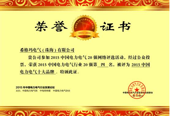2、 熱烈祝賀希格瑪電氣(珠海)有限公司榮獲 2015中國電力電氣20強(qiáng)網(wǎng)絡(luò)評選活動第四名的成績,被評為“2015中國電力電氣十大品牌”稱號